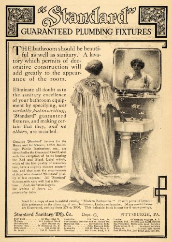 This is an original 1911 black and white print ad for the Standard Sanitary Manufacturing Company of Pittsburgh, Pennsylvania. The company was started in 1872 by John Pierce.