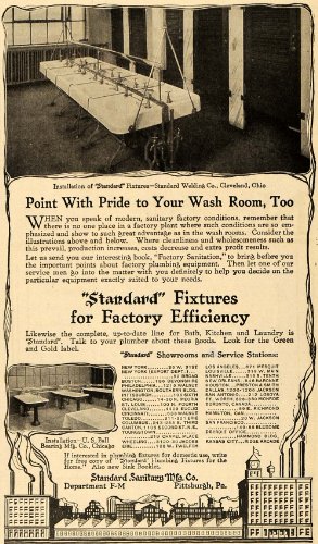 This is an original 1917 black and white print ad for "Standard" Fixtures for Factory Efficiency by the Standard Sanitary Manufacturing Company located in Pittsburgh, Pennsylvania. There is a picture of "Standard" fixtures at the Standard Welding Company in Cleveland, Ohio and at the U. S. Ball Bearing Manufacturing Company in Chicago.